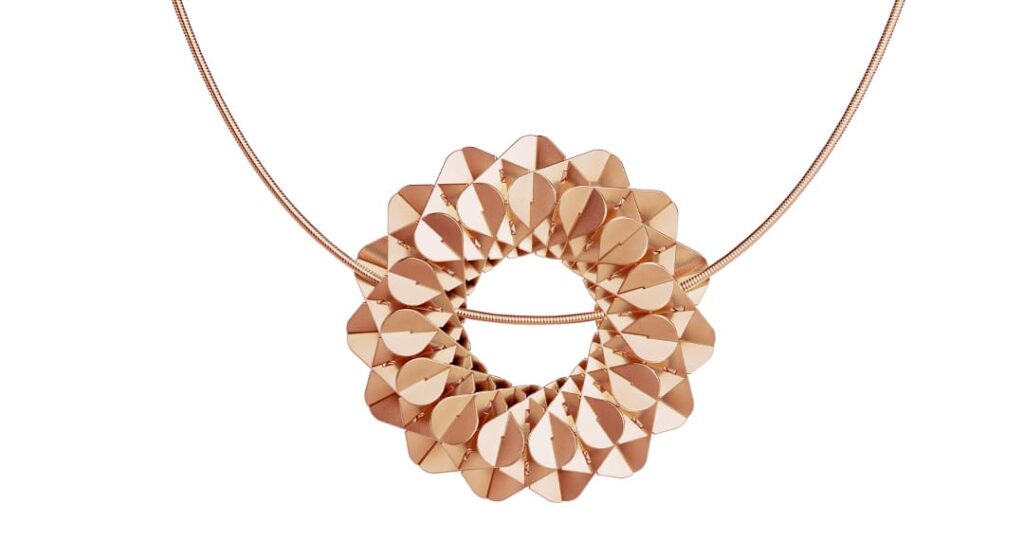 Die Komposition aus Kreis, Oval und Dreieck wirkt organisch und klar zugleich. Jedes Element ist identisch geformt und dennoch entsteht durch ihre rhythmische Anordnung ein lebendiges Ganzes. Das Schmuckstück folgt der Bewegung und reflektiert das Licht, wodurch es lebendig erscheint.