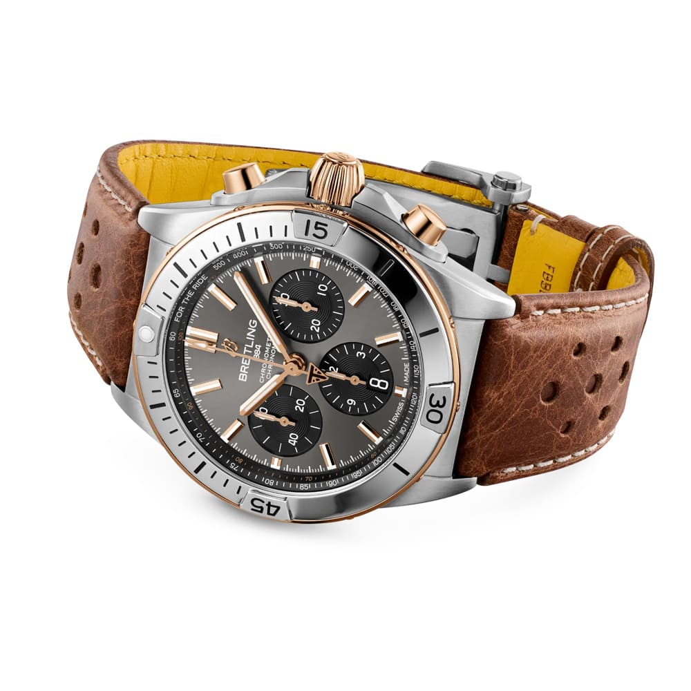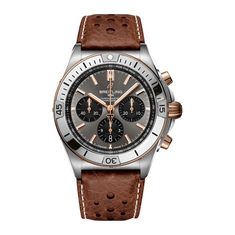 Die Kooperation mit der Kultmarke Triumph Motorcycles verleiht der Chronomat eine neue, besonders maskuline Note. Das Gehäuse aus leichtem Titan und luxuriösem 18-karätigem Rotgold unterstreicht den Premiumanspruch, während das perforierte Kalbslederarmband in sattem Braun den sportlich-dynamischen Charakter betont. Mit einem Durchmesser von 42 Millimetern ist die Uhr präsent, aber tragbar – ideal für den Alltag und jedes Abenteuer.