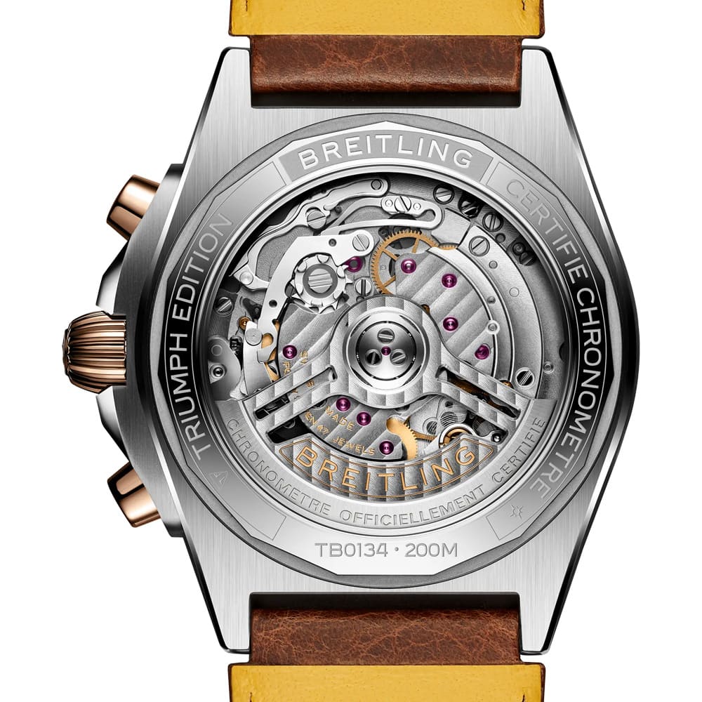 Im Inneren arbeitet das Manufakturkaliber Breitling 01, ein Automatikwerk mit 70 Stunden Gangreserve, Chronographenfunktion und Datumsanzeige bei 6 Uhr. Der verschraubte Saphirglasboden gibt den Blick auf das fein finissierte Werk frei und trägt die Gravur „Triumph Edition“. Weitere subtile Referenzen an die Motorradwelt – wie das Triumph-Logo auf dem Gegengewicht des Chronographenzeigers – runden das Design ab.
