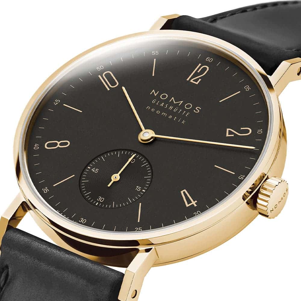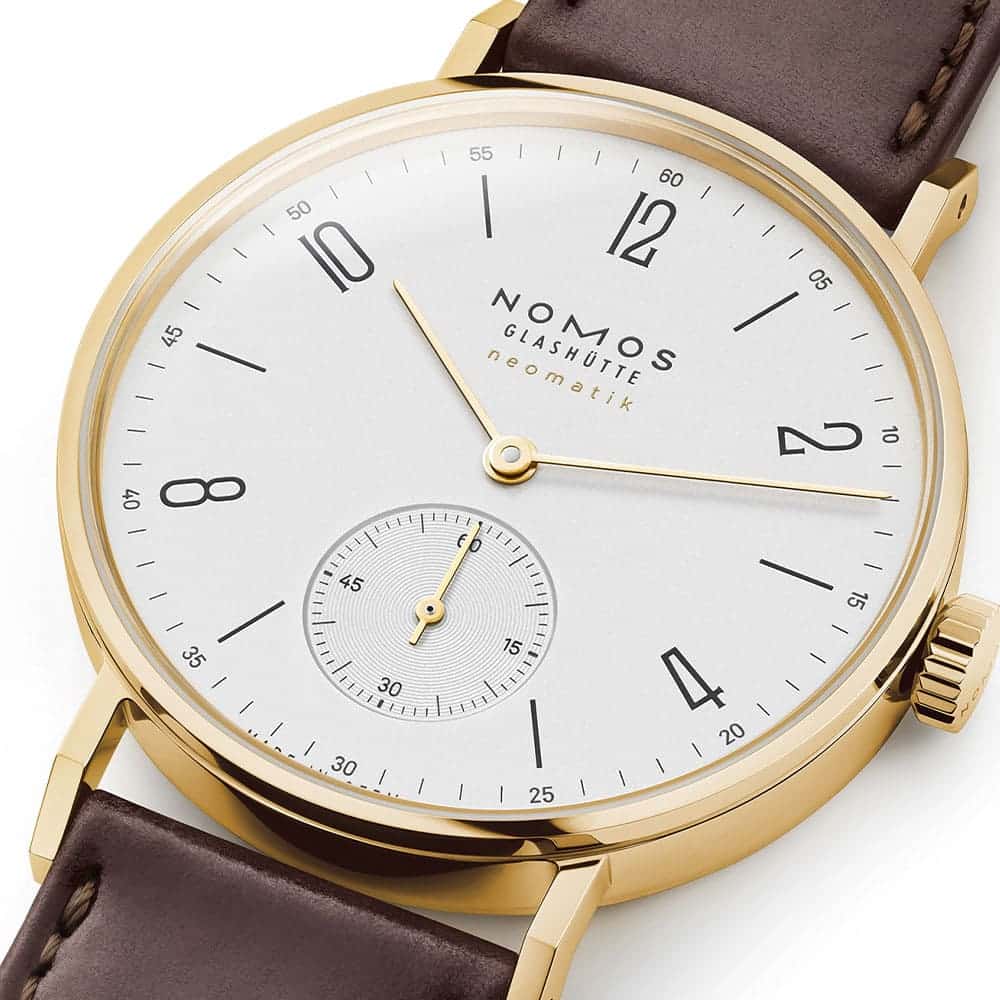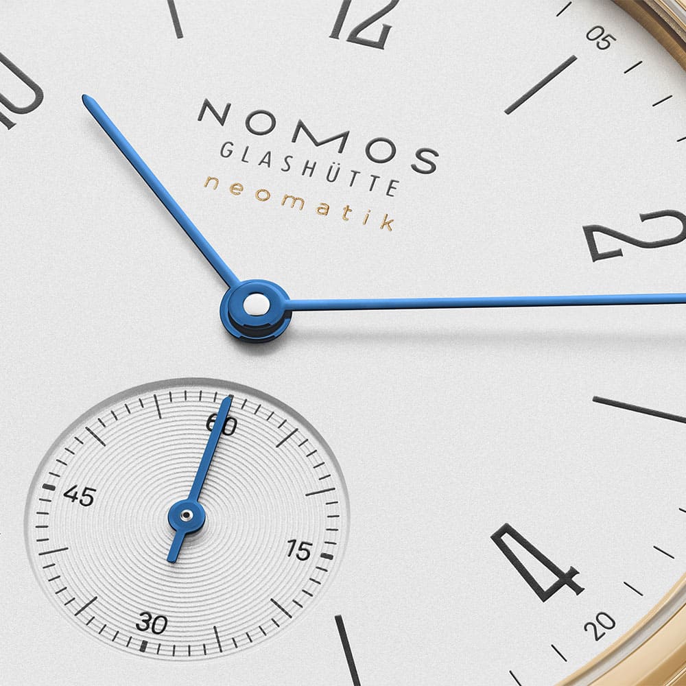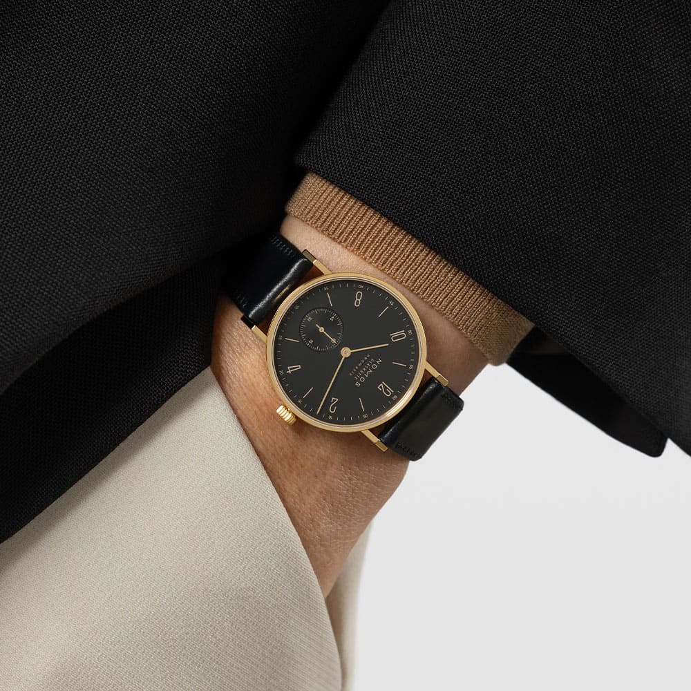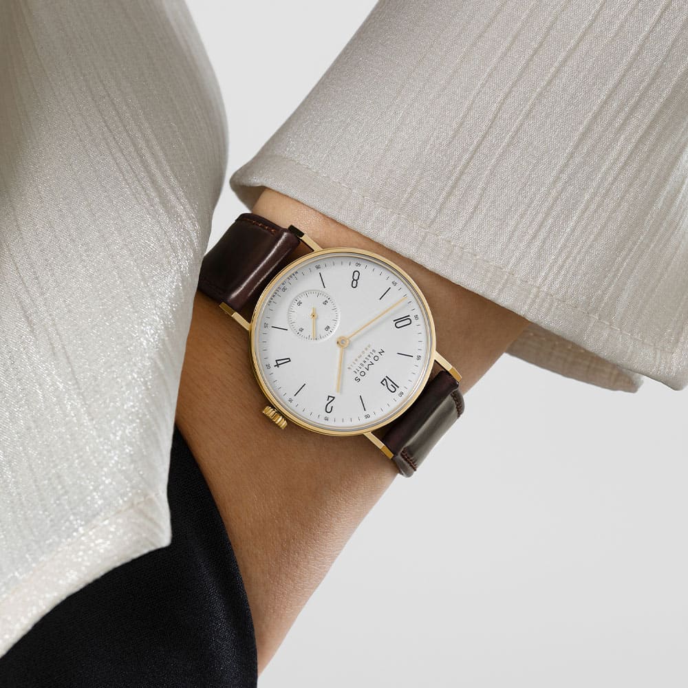 Der Einsatz von Gold folgt bei NOMOS keiner lauten Inszenierung. Vielmehr unterstreicht das 18-karätige Gelbgold die klare Gestaltung der Tangente und verleiht ihr eine neue, warme Ausstrahlung. Die Uhr wirkt dadurch präsenter, ohne an Leichtigkeit zu verlieren – eine Balance, die nur wenigen Designs gelingt. Gold wird hier nicht zum Selbstzweck, sondern zum Mittel, um die charakteristische Form noch bewusster hervorzuheben.