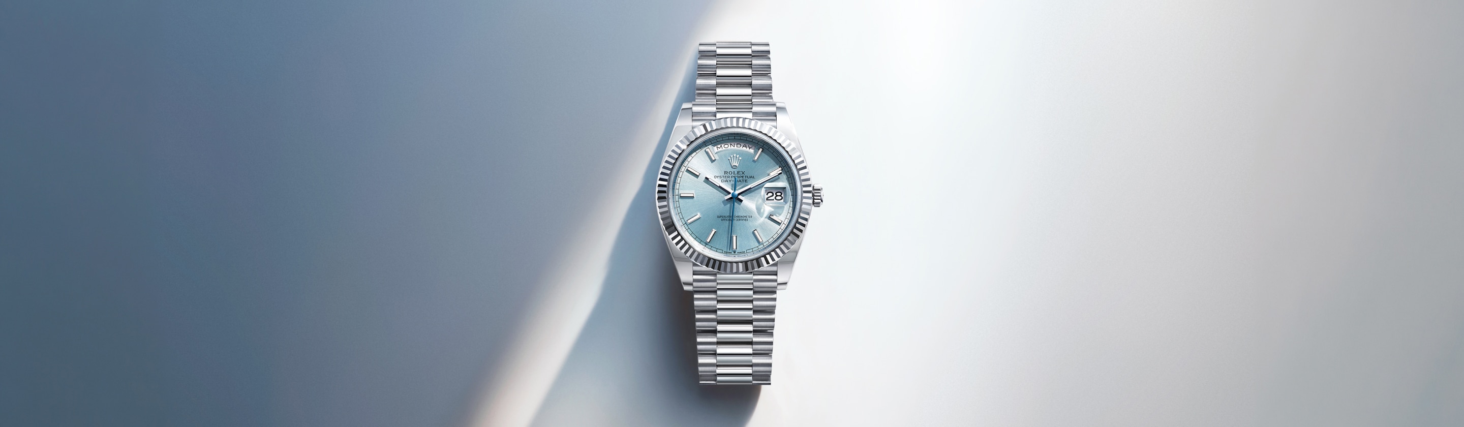 Im Jahre ihrer Einführung 1956 stellte die Day-Date eine bedeutende Innovation dar: Sie war die erste Armbanduhr mit Kalenderfunktion, die zusätzlich zum Datum den ausgeschriebenen Wochentag in einem halbkreisförmigen Sichtfenster auf der 12 Uhr-Position anzeigte – damals eine echte technische Spitzenleistung. Sie ist ausschließlich in Edelmetall – 18 Karat Gelb-, Weiß- oder Everose-Gold oder Platin 950 – und mit ihrem legendären President-Band erhältlich. Dank ihrer verschiedenen Zifferblätter eignet sie sich bestens dazu, der Persönlichkeit ihres Trägers Ausdruck zu verleihen.