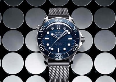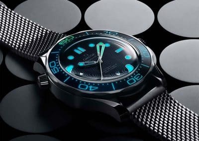 Die Uhr zum 60-jährigen Jubiläum ist klassisch gehalten – und entspricht so ganz dem Stil des Agenten. Sie bietet ein blaues Zifferblatt mit lasergravierten Wellen, die von dem Modell inspiriert sind, das James Bond im Film „GoldenEye“ trug. Darauf drehen skelettierte Zeiger für Stunden und Minuten ihre Runden sowie ein Lollipop-Sekundenzeiger aus weiß lackiertem Aluminium. Eine weitere Besonderheit findet sich auf der Lünette: Bei 12 Uhr ist nicht das sonst in der Reihe übliche umgekehrte Dreieck zu sehen, sondern eine 60 – als Hommage an die sechs Jahrzehnte der Filmreihe. Das Omega Master Chronometer Kaliber 8806 schenkt der Agentenuhr im 42-mm-Edelstahlgehäuse hochpräzisen Antrieb. Ihr Edelstahlarmband im Milanaise-Stil erinnert an die Titanuhr, die der Agent im Film „Keine Zeit zu sterben“ trug.