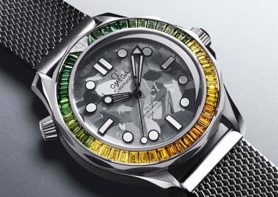 Neben dem Modell aus Edelstahl zeigt Omega eine exklusive Version der Seamaster Diver 300M mit Gehäuse und Armband aus Canopus-Gold. Das Zifferblatt der Uhr ist hier aus grauem Silizium gefertigt und vom Sand von Bonds Versteck in der Karibik inspiriert. Grüne und gelbe Diamanten, mit denen die Lünette besetzt ist, schenken dem Modell Leuchtkraft – eine Anspielung auf die Farben der Flagge Jamaikas. Auch das Co-Axial Master Chronometer Kaliber 8807, das dieses Modell antreibt, ist eine Klasse für sich. Es ist eine Luxusversion des Werks, das in der Edelstahlversion der James-Bond-Uhr arbeitet. Ob Edelstahlausführung oder Gold-Edition – diese Seamaster Diver 300M ist ein ganz besonderer Zeitmesser mit dem gewissen Extra für Filmfans und Uhrensammler.