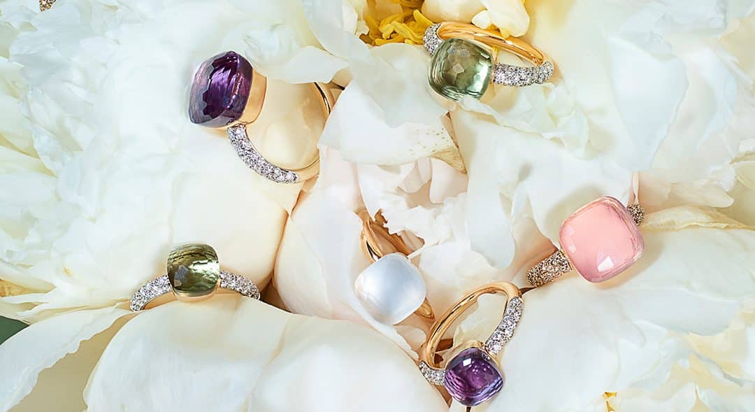 Seit mehr als 20 Jahren erfreuen sich die mit leuchtenden Edelsteinen besetzten Nudo-Ringe der Mailänder Schmuckmanufaktur Pomellato großer Beliebtheit. Das heute angesagte Ring Stacking – das Kombinieren mehrerer Ringe an einem Finger – ist hier schon lange Programm.