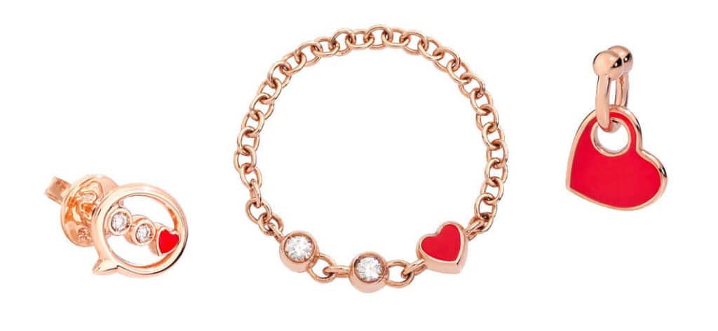 Ebenfalls aus 9-karätigem Roségold bestehen die Ohrringe „Botschaft“. Sie sind in Form einer kleinen Sprechblase gefertigt, wie man sie aus zum Beispiel aus Comics kennt. In der Sprechblase finden sich ein Herz aus roter Emaille und zwei weiße Diamanten. Dieses Ensemble drückt die „Botschaft“ der Liebe ganz deutlich aus: „Wir gehören zusammen.“