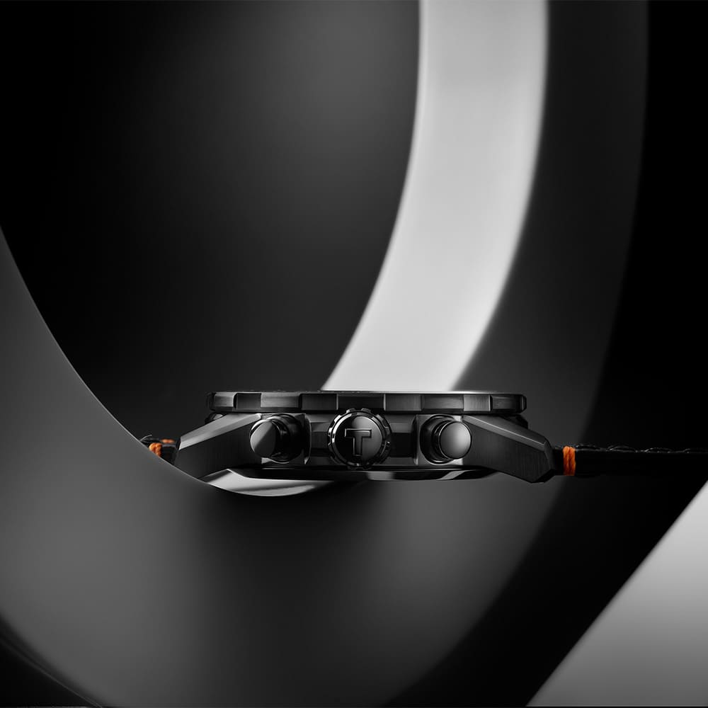 Die orangen Zeiger und Kontrastnähte an den Bandanstößen der Tissot Supersport Chrono Basketball Edition verweisen auf die Farbe des Basketballs, die Struktur des schwarzen Lederarmbands erinnert an seine Oberfläche. Dank des Schnellwechselsystems lässt sich das Armband einfach gegen andere passende Ausführungen tauschen. Perfekte Ergänzungen sind zum Beispiel die Tissot NBA-Lederarmbänder mit verschiedenen Teamlogos.