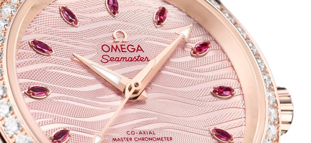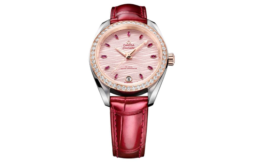 Mit der Seamaster Aqua Terra 150M wird ein Damenmodell vorgestellt, das mit seiner femininen Eleganz überzeugt. Die exquisite Uhr verbindet feinste Uhrmacherkunst mit einem stilistisch hochwertigen Design und wird durch ihre auffällige Farbgestaltung zum echten Hingucker am Handgelenk. Das 34 Millimeter kleine Gehäuse aus Edelstahl und 18-karätigem Sedna-Gold ziert ein Zifferblatt mit dem charakteristischen Wellendekor in zartem Rosa. Neben der dezenten Datumsanzeige auf 6 Uhr begeistern elf leuchtende Rubine im Marquise-Schliff als farbenfrohe Indizes. Umrandet wird das Zifferblatt von einer diamantbesetzten Lünette, die wie auch die Stunden-, Minuten- und Sekundenzeiger aus 18-karätigem Sedna-Gold gefertigt ist. Zusammen mit einem farblich passenden Lederarmband in schimmerndem Rot bekommt die attraktive Uhr eine warme Ausstrahlung, die sofort gute Laune auslöst. Ein Luxus, den Sie nicht wieder ablegen möchten!