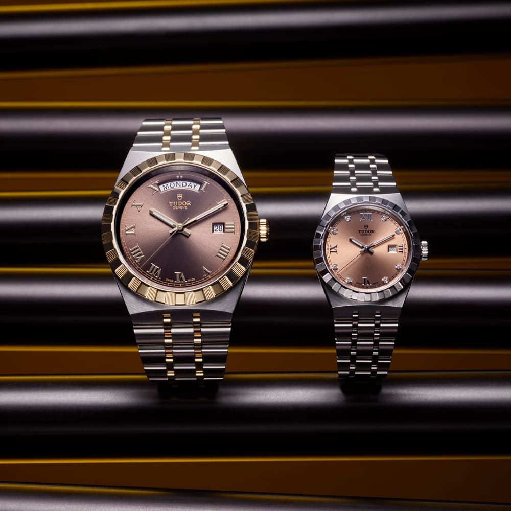 Die TUDOR Royal ist ein stilvoller Begleiter im Alltag. Ihre gekerbte Lünette und ihr integriertes Armband sind charakteristisch für die berühmte Uhr. Ab sofort ist sie mit den neuen edlen Zifferblattfarben schokoladenbraun und lachs erhältlich.