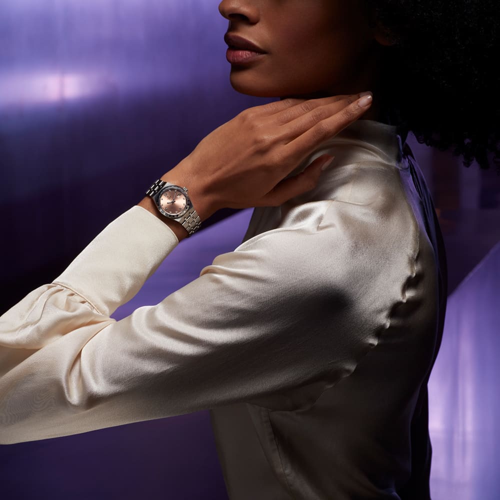 Von den aktuellen Damenmodellen der TUDOR Royal mit Diamantbesatz geht ein ganz besonderer Glanz aus, denn neben den Indizes strahlt auch die Lünette hier brillant – so wird die Uhr zum kostbaren Schmuckstück.