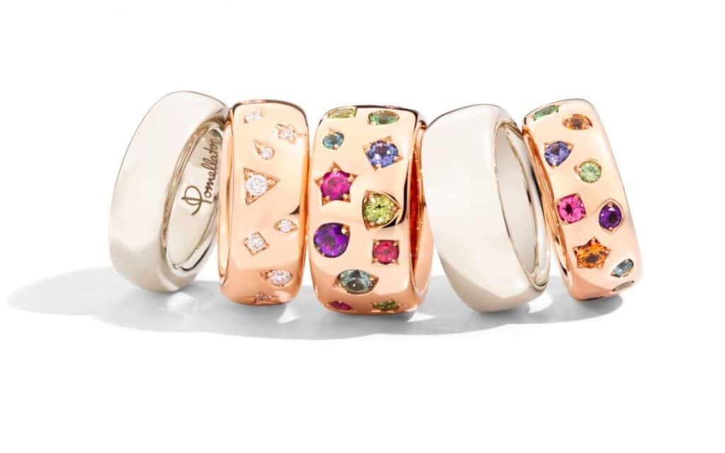 Echte Hingucker sind die voluminösen Bandringe, die ohne Ränder oder Absätze gearbeitet sind. In den frühen 1970er-Jahren von Pomellato kreiert, feiert dieser außergewöhnliche Ring nun sein Comeback. Harmonisch umfließt er die Finger seiner Trägerin und ist dank innovativer Materialverarbeitung ein echtes Leichtgewicht. Die Ringe gibt es in 18k Weiß- oder Roségold, wobei die Variante in Roségold in drei unterschiedlichen Breiten erhältlich ist. Ob verspielt mit bunten Edelsteinen in Stern-, Dreieck-, Tropfen- und Quadratform oder exklusiv mit funkelnden Diamanten in Pavé-Fassung – die Bandringe versprühen Lebensfreude pur!