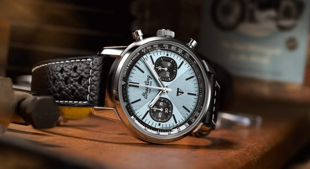 Auch gemeinsam mit dem britischen Heritage-Motorradhersteller Triumph blickt Breitling bereits auf eine erfolgreiche Zusammenarbeit zurück, sie fand im Jahr 2022 statt. Wie ihre Vorgängermodelle aus dem vergangenen Jahr ist auch das diesjährige Modell mit einem einzigartig eisblauen Zifferblatt ausgestattet, dessen Farbe exakt auf eine Triumph Thunderbird 6T aus dem Jahr 1951 und eine seltene Breitling Top Time Ref. 815 mit blauem Zifferblatt aus den 1970er-Jahren abgestimmt ist. Das Zifferblatt weist eine Twin-Register-Anzeige und eine Tachymeterskala zur Geschwindigkeitsmessung auf, die Logos von Breitling und Triumph sind bei 12 und 6 Uhr positioniert. Diese aktuelle Version der Top Time Triumph gewährt durch einen neuen transparenten Gehäuseboden einen Blick auf den raffinierten Mechanismus des Uhrwerks. Das Modell gehört zur Kernkollektion von Breitling und ist mit schwarzem Kalbslederarmband im Rennsport-Look oder mit einem Metallarmband erhältlich.