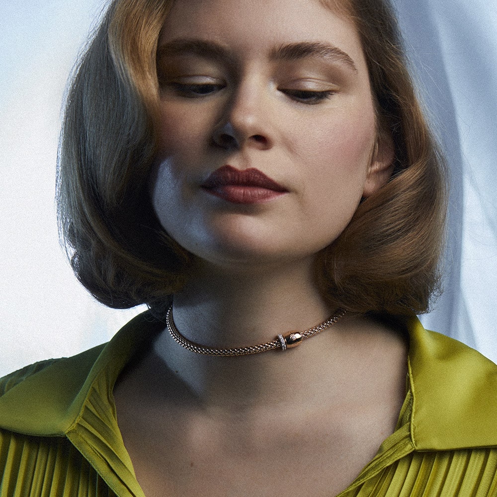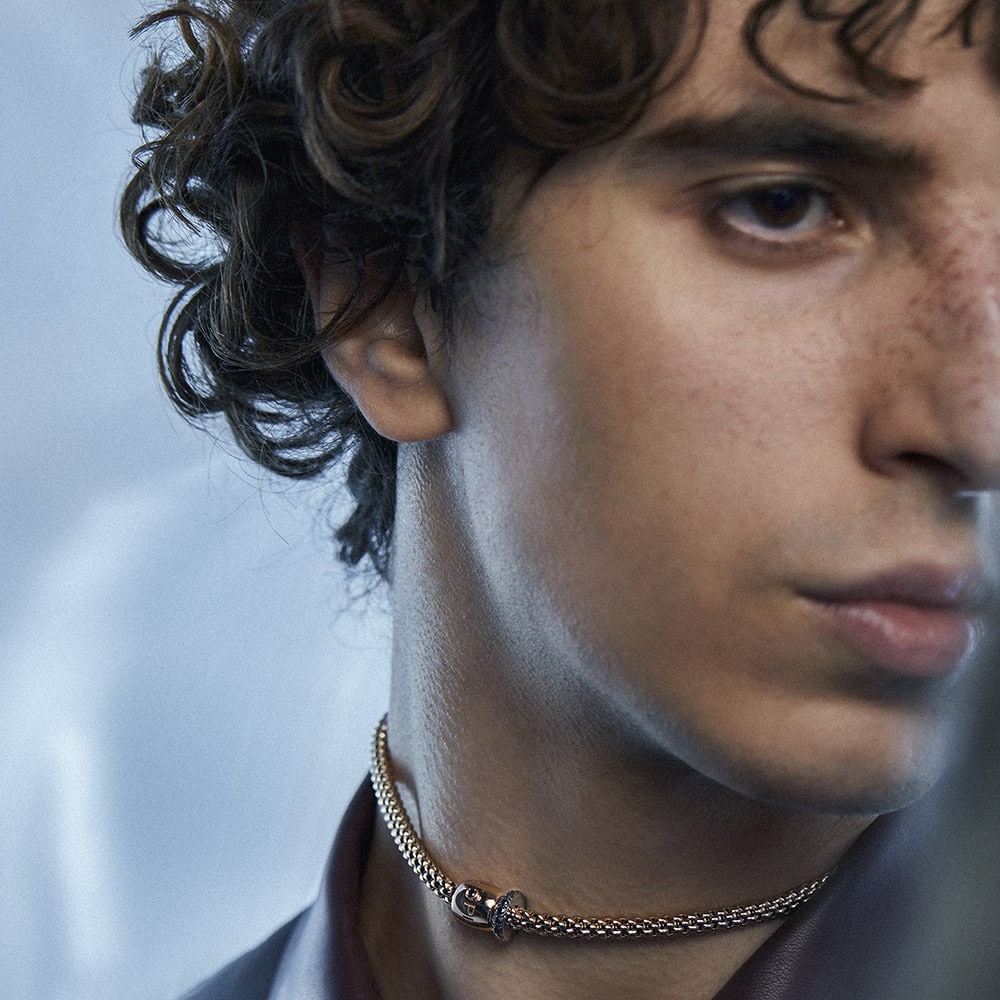 Das Schmucklabel Fope hat sich meisterhaft dem Revival der Choker-Kette angenommen und sie auf ein neues Niveau gebracht. In der Linie Solo präsentieren die Italiener eine Art Choker, der die Essenz des markanten Schmuckstücks in einem zeitgenössischen Stil einfängt und sich sowohl von Aristokratie als auch von Punk abhebt. Ein supermoderner Look, kreiert mit hochwertigen und langlebigen Materialien.