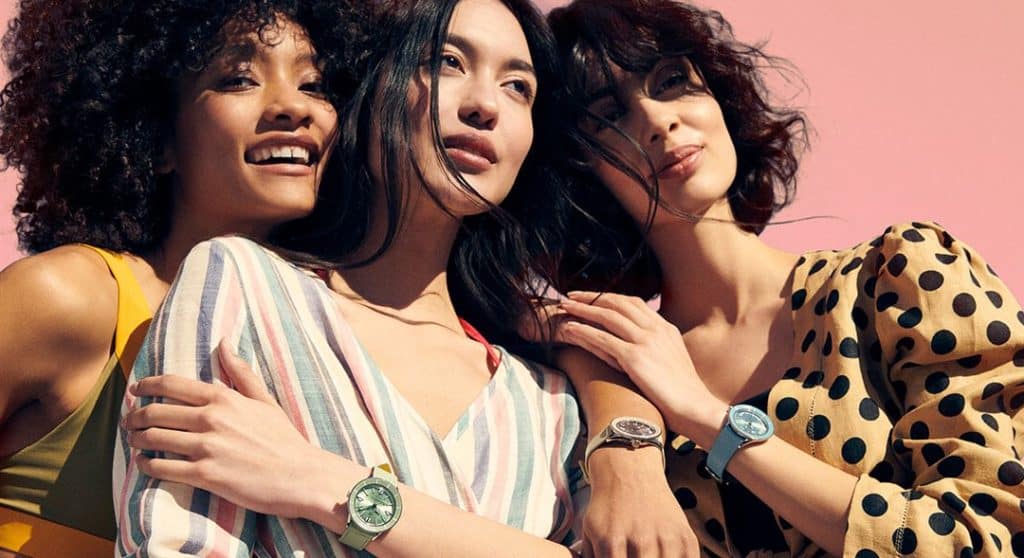 Die aktuellen Varianten zeigen sich farblich monochrom: Zifferblätter, Lünetten und Armbänder sind einheitlich gehalten. Nur die orangefarbene Version tanzt fröhlich aus der Reihe: Auf ihrem weißen Zifferblatt leuchten die Indizes und Zeiger in Gelb-, Grün-, Blau-, Indigo-, Violett-, Rot- und Orangetönen.