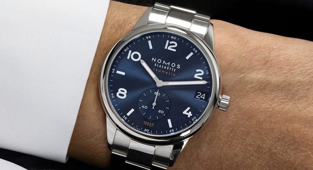 Die neue NOMOS Club Sport neomatik 42 Datum Blau ist eine robuste Sportuhr, die aufgrund ihres schlanken Designs äußerst angenehm zu tragen ist. Ein besonderes Highlight ist das nahtlos an das Gehäuse angepasste Edelstahlarmband, das eigens für die Club Sport Modelle entwickelt wurde. Es schmiegt sich wunderbar sanft an das Handgelenk an und bietet bei sportlichen Aktivitäten wie dem Tauchen, Klettern oder anderen Outdoor-Aktivitäten dank Sicherheitsfaltschließe einen optimalen Halt. Doch nicht nur beim Sport überzeugt dieses neue Modell. Der moderne Edelstahllook macht die Club Sport auch zu einer perfekten Begleiterin im Alltag. Das Metallarmband ist dreireihig und insgesamt 20 Millimeter breit. Die Uhr lässt sich individuell an den Umfang des Handgelenks anpassen, da einzelne Glieder entfernt oder hinzugefügt werden können.
