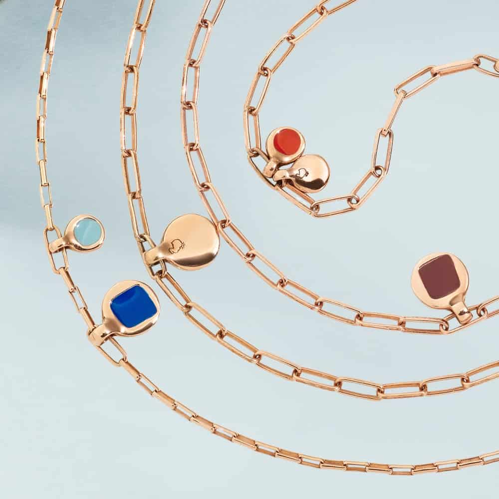 Das Design der Schmuckstücke mit ihren verschieden großen Kettenelementen wirkt sehr modern. Die bunten Emailleanhänger, die den Kreationen Leichtigkeit schenken, bilden einen verspielten Kontrast dazu. Rund oder eckig, ziehen sie in Rot, Blau, Türkis und Braun die Blicke auf sich.