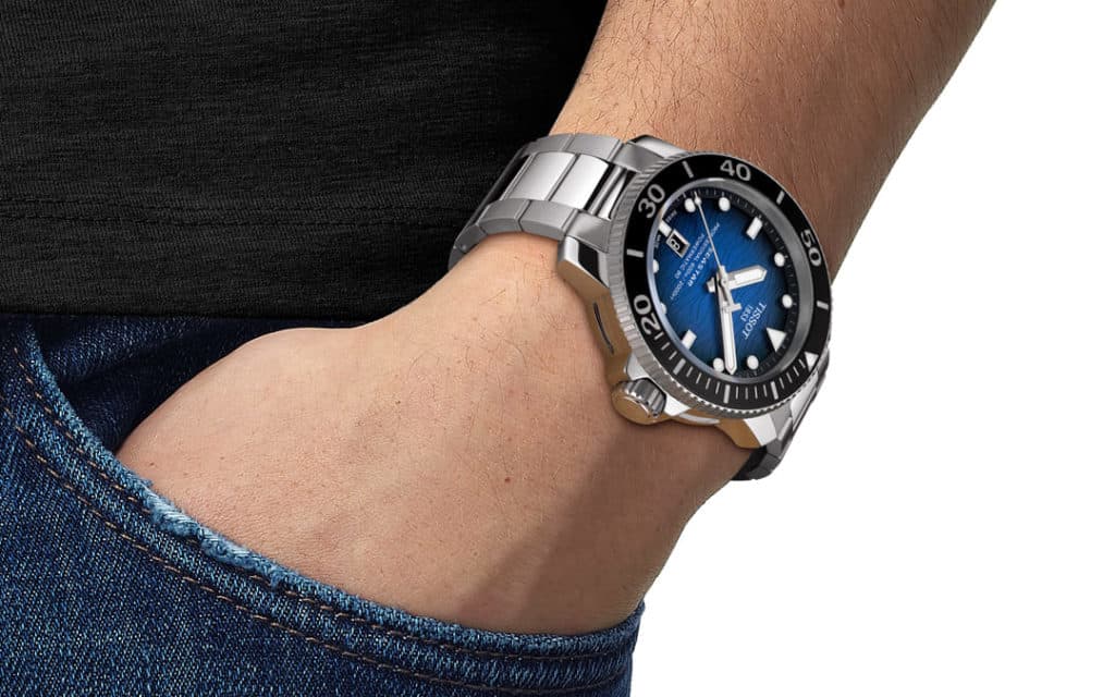 Mit einer Wasserdichtheit bis 60 bar und somit bis zu 600 Metern verbessert die Tissot die Taucherfunktionalität der neuen Seastar erheblich – sie ist für große Tiefen gemacht.