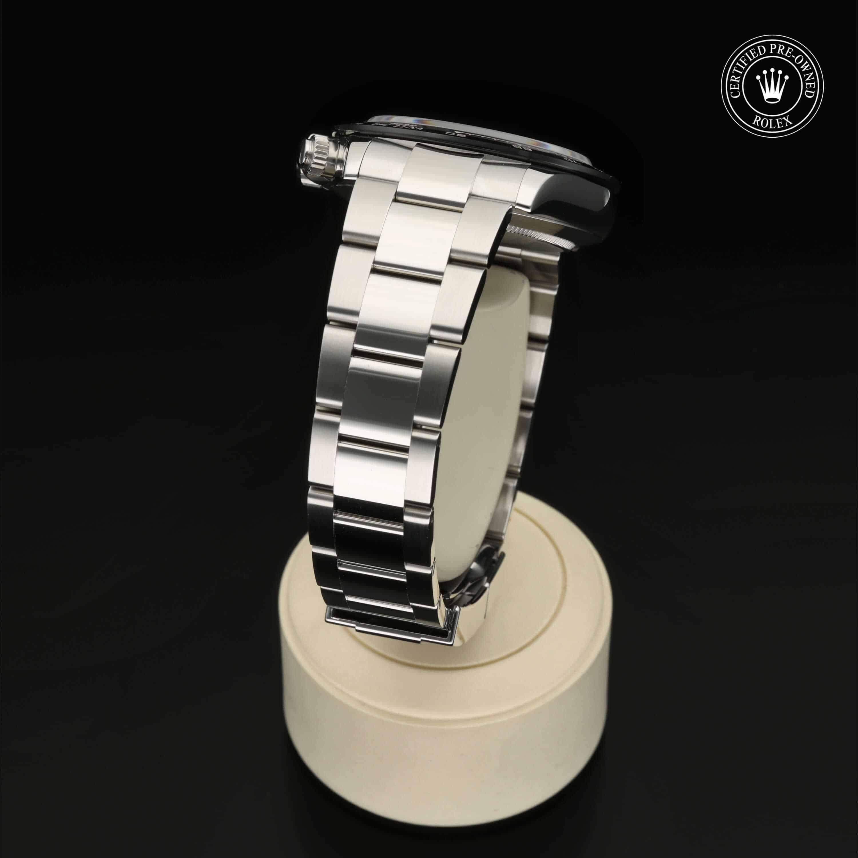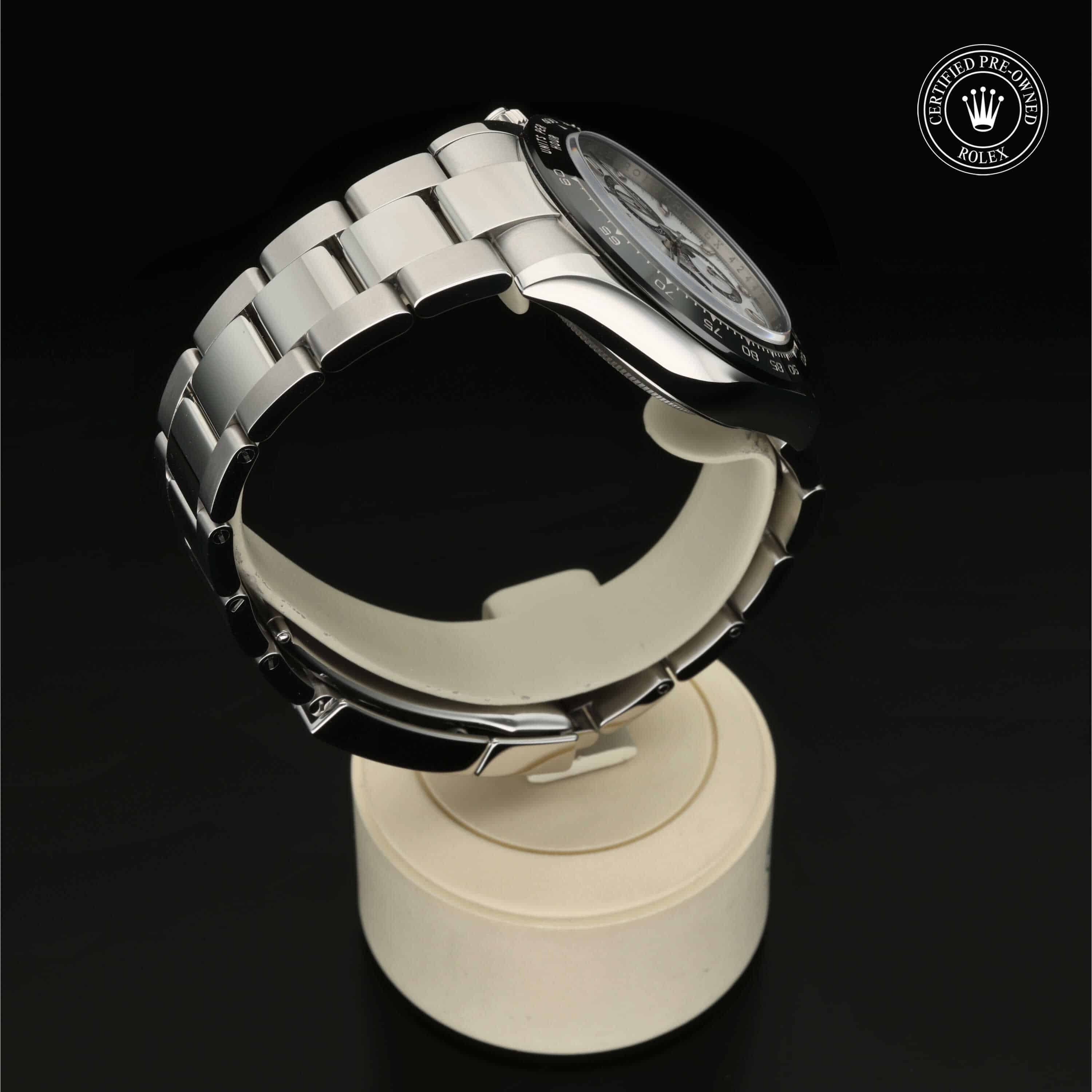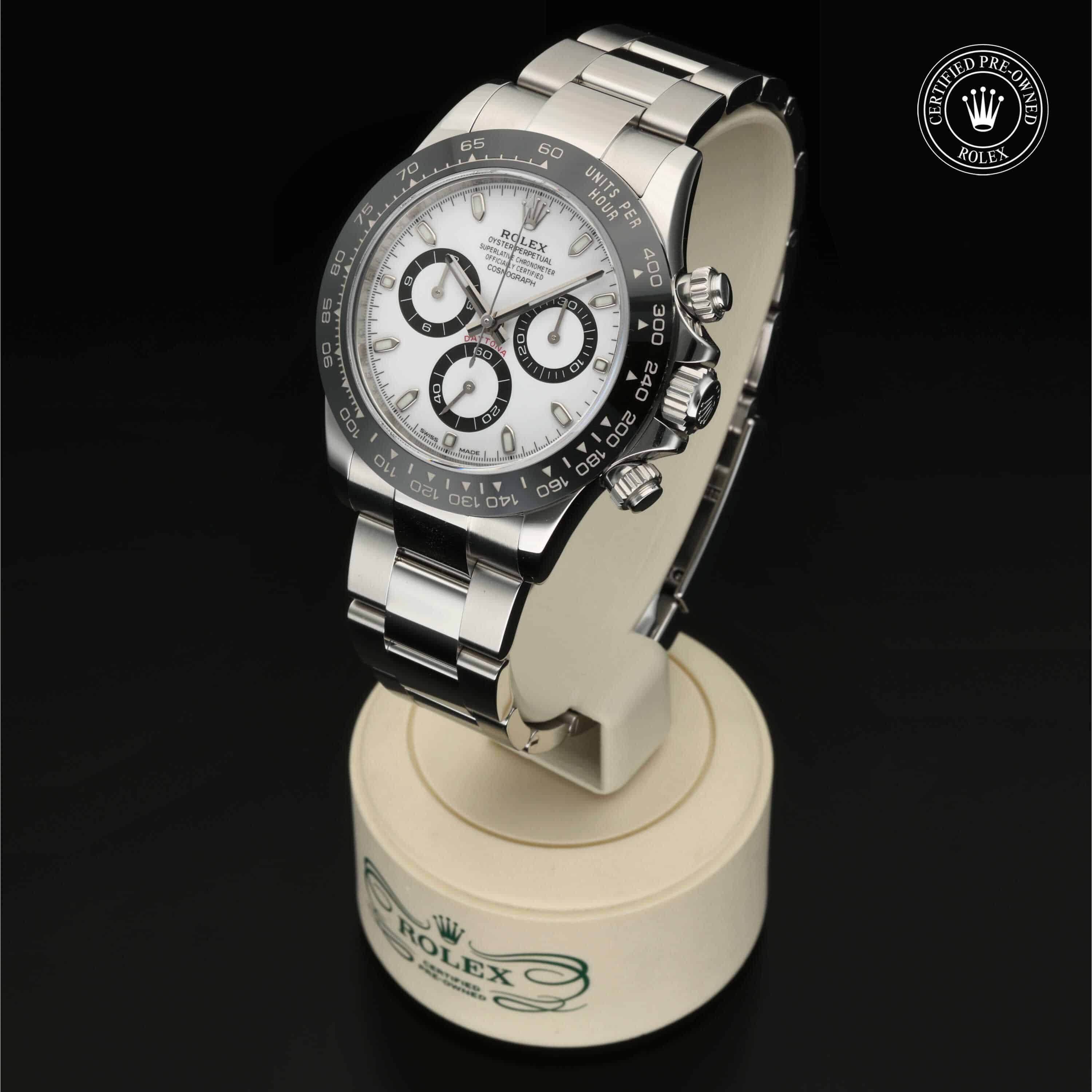 Das 1963 vorgestellte symbolträchtige Modell Oyster Perpetual Cosmograph Daytona war auf die Ansprüche von Profis des Automobilrennsports zugeschnitten. Heute ist dieser Chronograph bekannt für seine Zuverlässigkeit, die er seinem leistungsstarken mechanischen Uhrwerk verdankt, das vollständig von Rolex entwickelt und hergestellt wurde. Mit der Tachymeterlünette kann der Träger Zeitabstände messen und eine Durchschnittsgeschwindigkeit ermitteln.