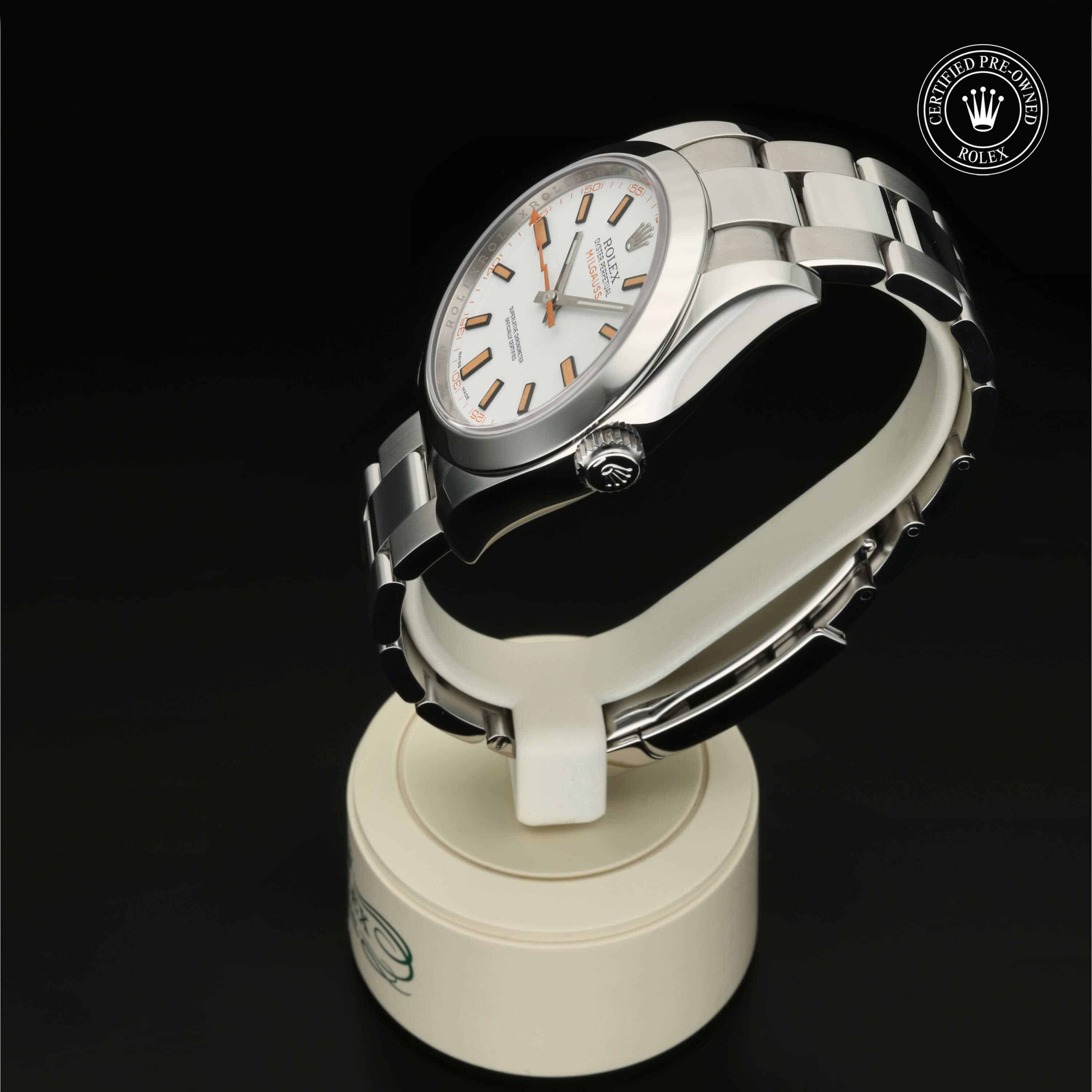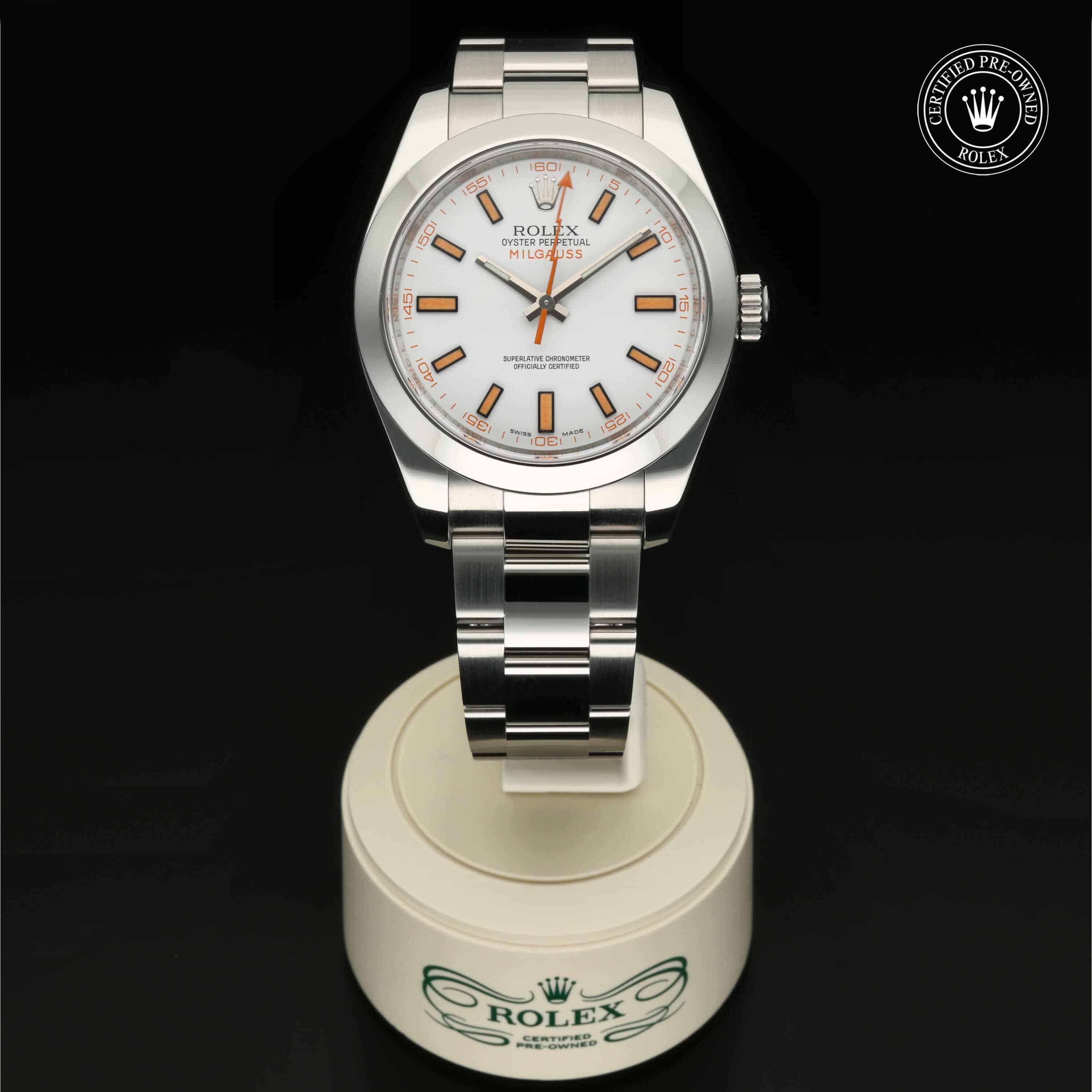 Die 1956 vorgestellte Oyster Perpetual Milgauss ist eine innovative Armbanduhr mit amagnetischen Eigenschaften und wurde für jene entwickelt, die in ihrem beruflichen Umfeld magnetischen Störeinflüssen ausgesetzt sind, die mechanische Uhren beeinträchtigen können. Es galt, eine Uhr zu entwickeln, die starken Magnetfeldern bis zu 1.000 Gauß standhalten konnte – einer alten Maßeinheit für magnetische Induktion, daher ihr Name (mille ist das französische Wort für tausend). Diese Uhr verdankt ihre außergewöhnliche chronometrische Leistung einem patentierten Magnetschirm, der das Uhrwerk schützt.